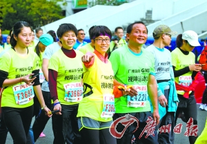 今年广马首次出现视障方阵,35位视障人士首次尝鲜,和视障方阵一起冲过终点线的还有11位来自广东省残肢人协会的轮椅跑手。